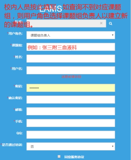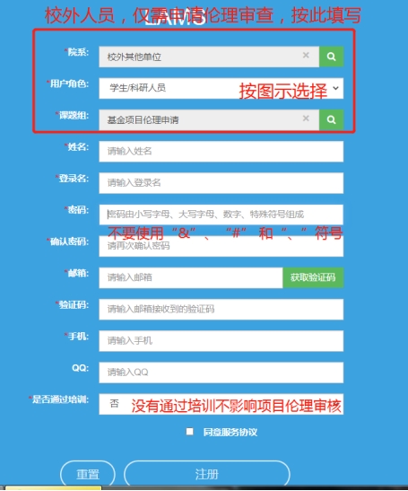 (2)校外人员按下图要求填写注册信息,院系选校外其他单位,用户角色选学生/科研人员,课题组选基金项目伦理申请。